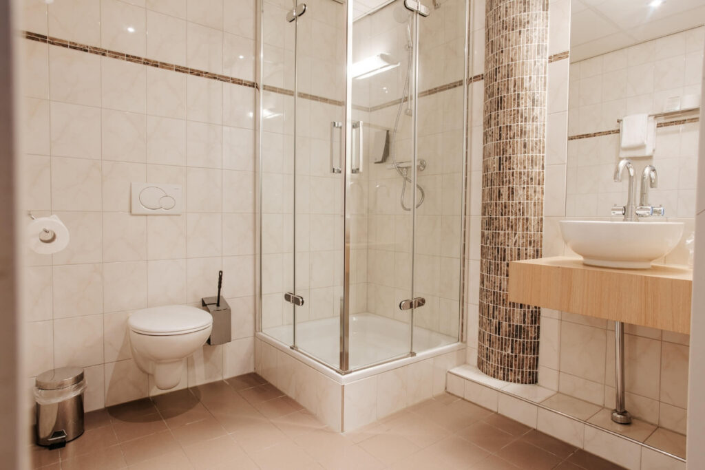 - Badkamer met douche of bad
